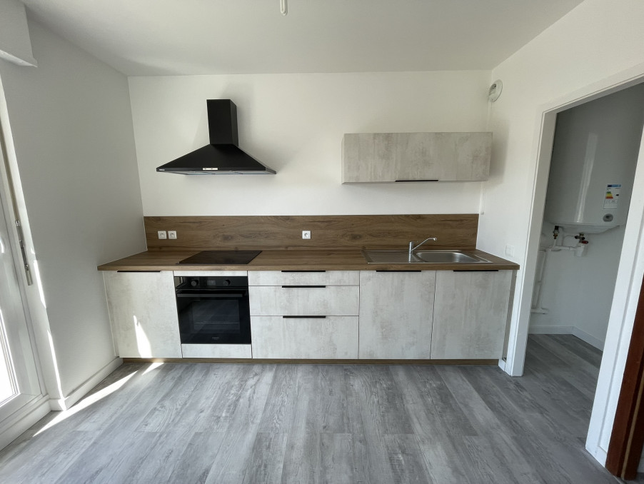 Une entrée avec placard, une cuisine équipée neuve ouverte sur le séjour avec un accès balcon, un cellier, deux chambres, une salle bains.